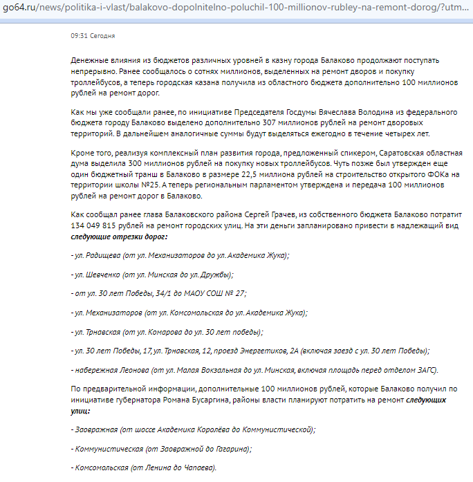 Один новостной сайт сегодня, переписывая вчерашнюю новость про дополнительное выделение 100 миллионов рублей на дороги Балакова, ввёл в заблуждение читателей. По их информации, ремонтировать будут… дороги на ул.Заовражная (от шоссе Академика Королёва до Коммунистической); Коммунистическая (от Заовражной до Гагарина); Комсомольская (от Ленина до Чапаева). И всё бы ничего, но эти участки заасфальтировали в прошлом году…