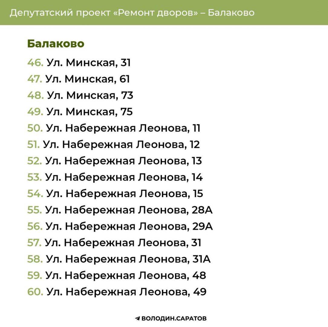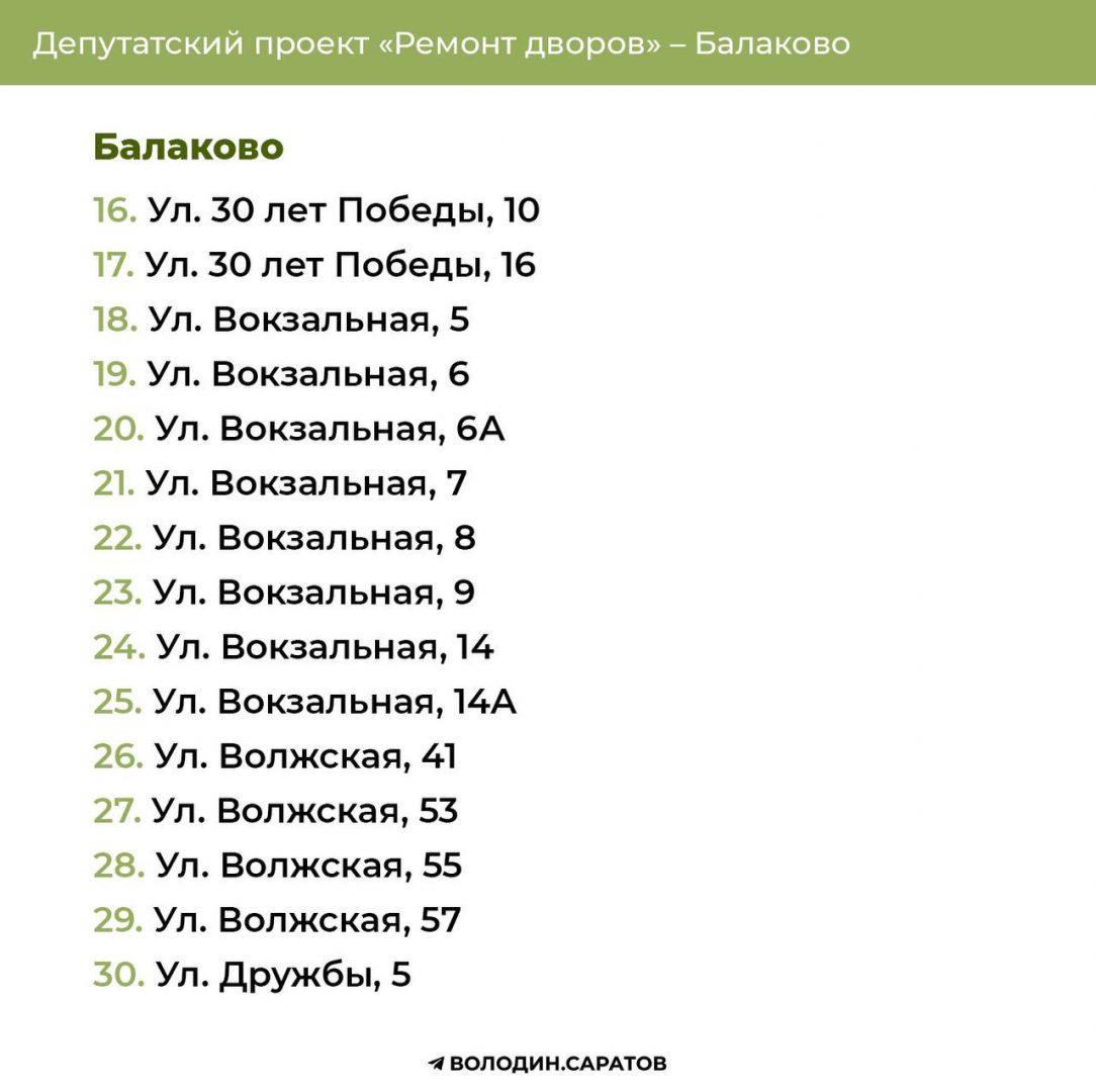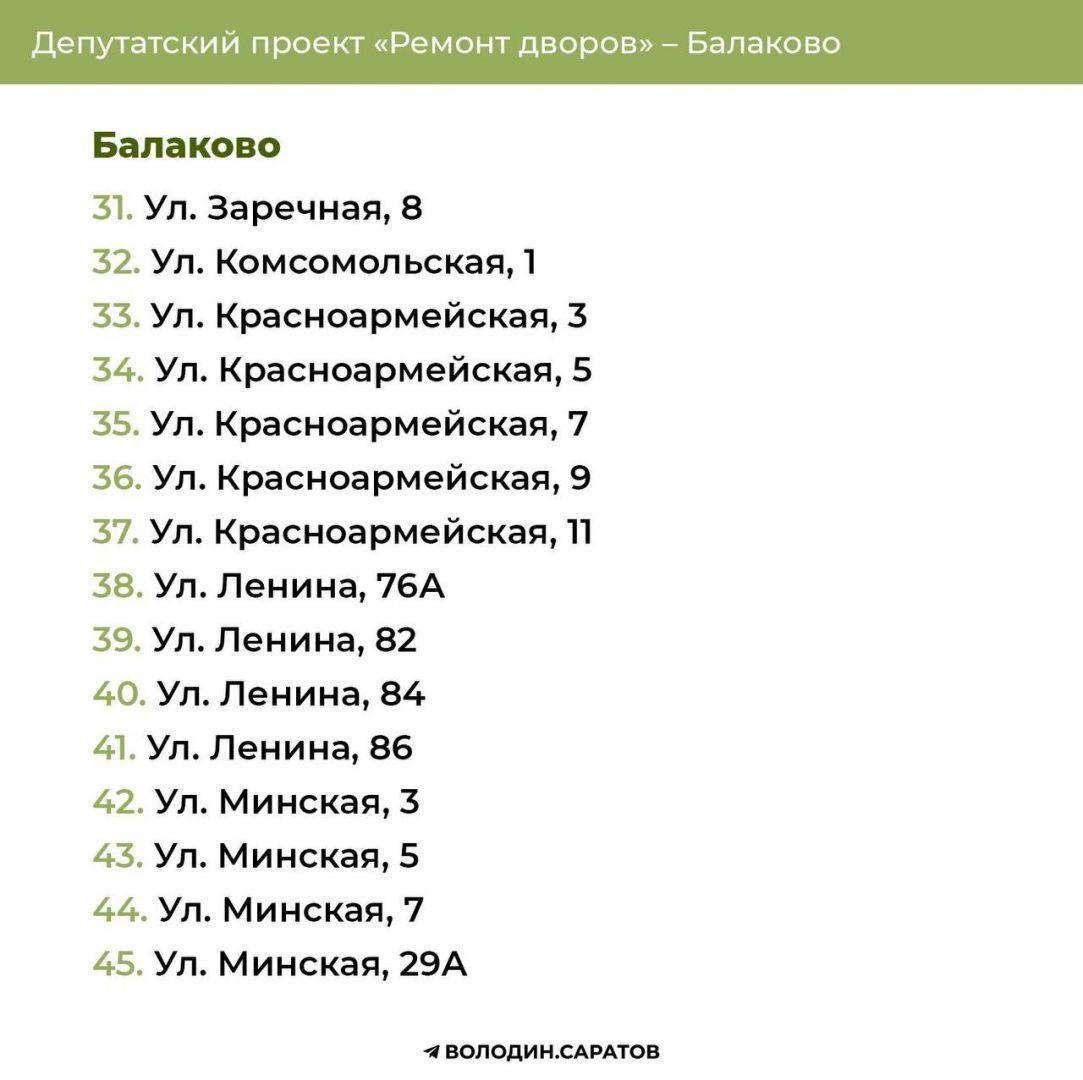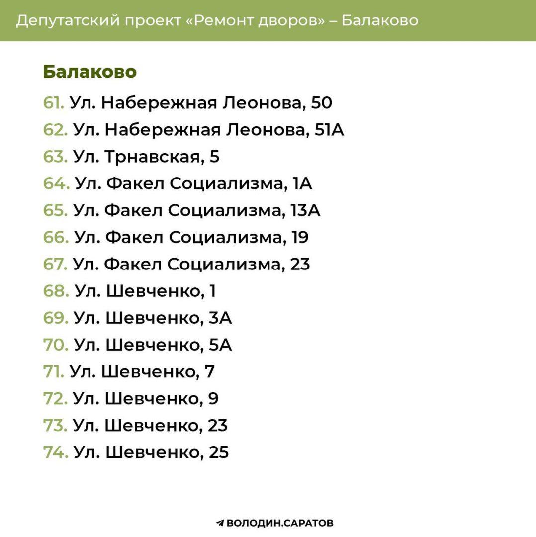 В следующем году в городе Балаково в рамках депутатского проекта «Ремонт дворов», инициированного Вячеславом Володиным, будут благоустроены дворовые территории у 74 домов.