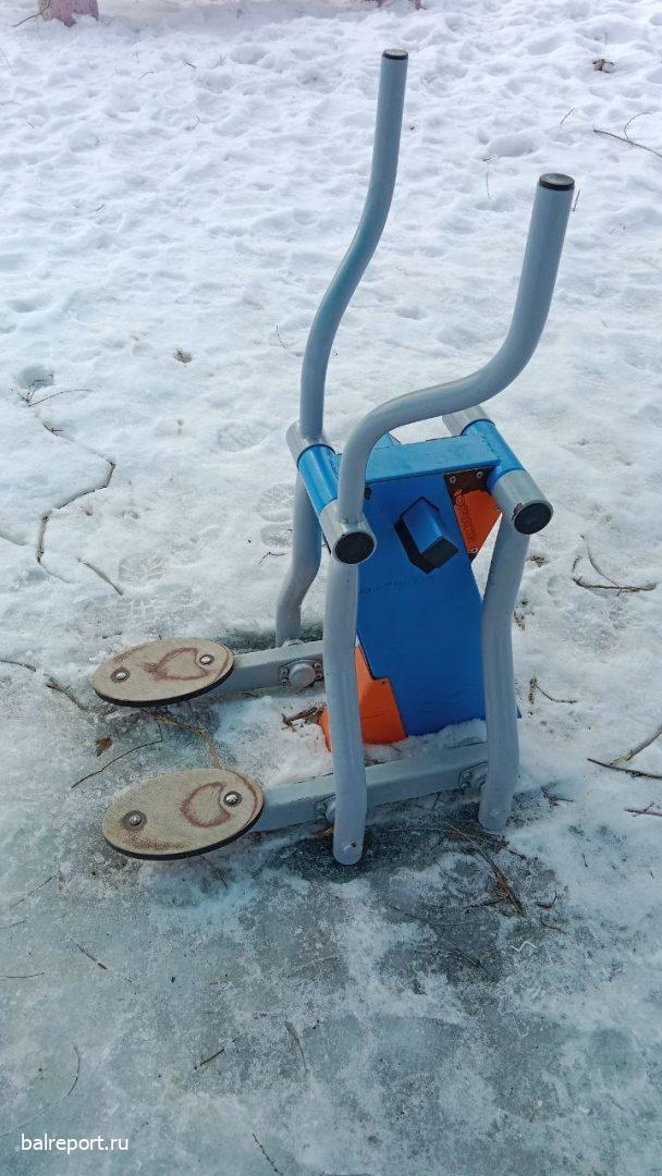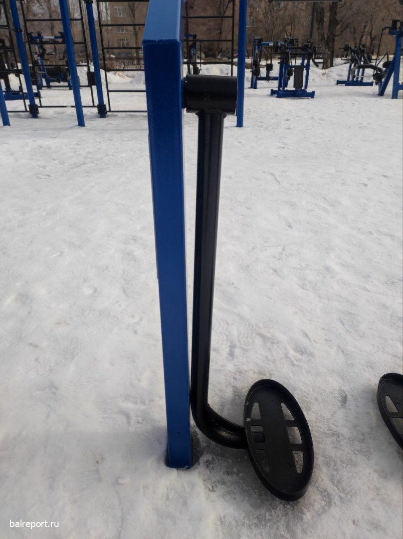 Только на одном элементе сломана пластиковая спинка, но народные умельцы заменили её на мягкий поролон, что позволяет заниматься и на этом тренажёре. Отметим, что доступ к площадке зимой закрыт из-за нечищенного снега, но люди сами натоптали тропинки к некоторым тренажёрам.