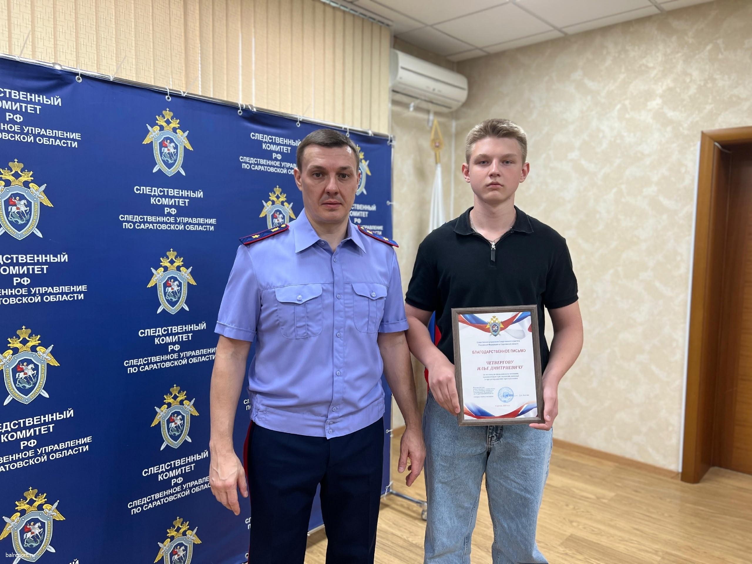 Ученик 9 А класса СОШ № 18 г. Балаково Четвергов Илья награждён благодарственным письмом руководителя СУ СК РФ по Саратовской области за активную гражданскую позицию, проявленную при оказании помощи в предотвращении преступления.