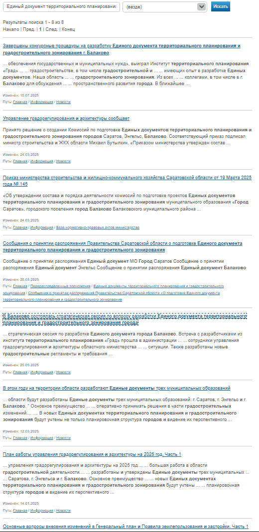 Мнение граждан по проекту тоже учтут: с 20 октября по 11 ноября проводятся общественные обсуждения. Да вот беда: ссылка, которую прикладывают в релизе ( https://www.minstroy.saratov.gov.ru/ ), ведёт просто на сайт минстроя. Где конкретно там искать сам проект, информационные материалы, непонятно. Мы ввели в поисковую строку название «Единый документ территориального планирования и градостроительного зонирования города Балаково», но поиск выдал только 8 новостных статей (часть из них — от января 2025 года, часть летних, одна, самая «свежая» — от 25 сентября). Никакого проекта там нет. Для чего его запрятали в недра сайта? Как его отыскать балаковцам, которые хотят с ним ознакомиться?