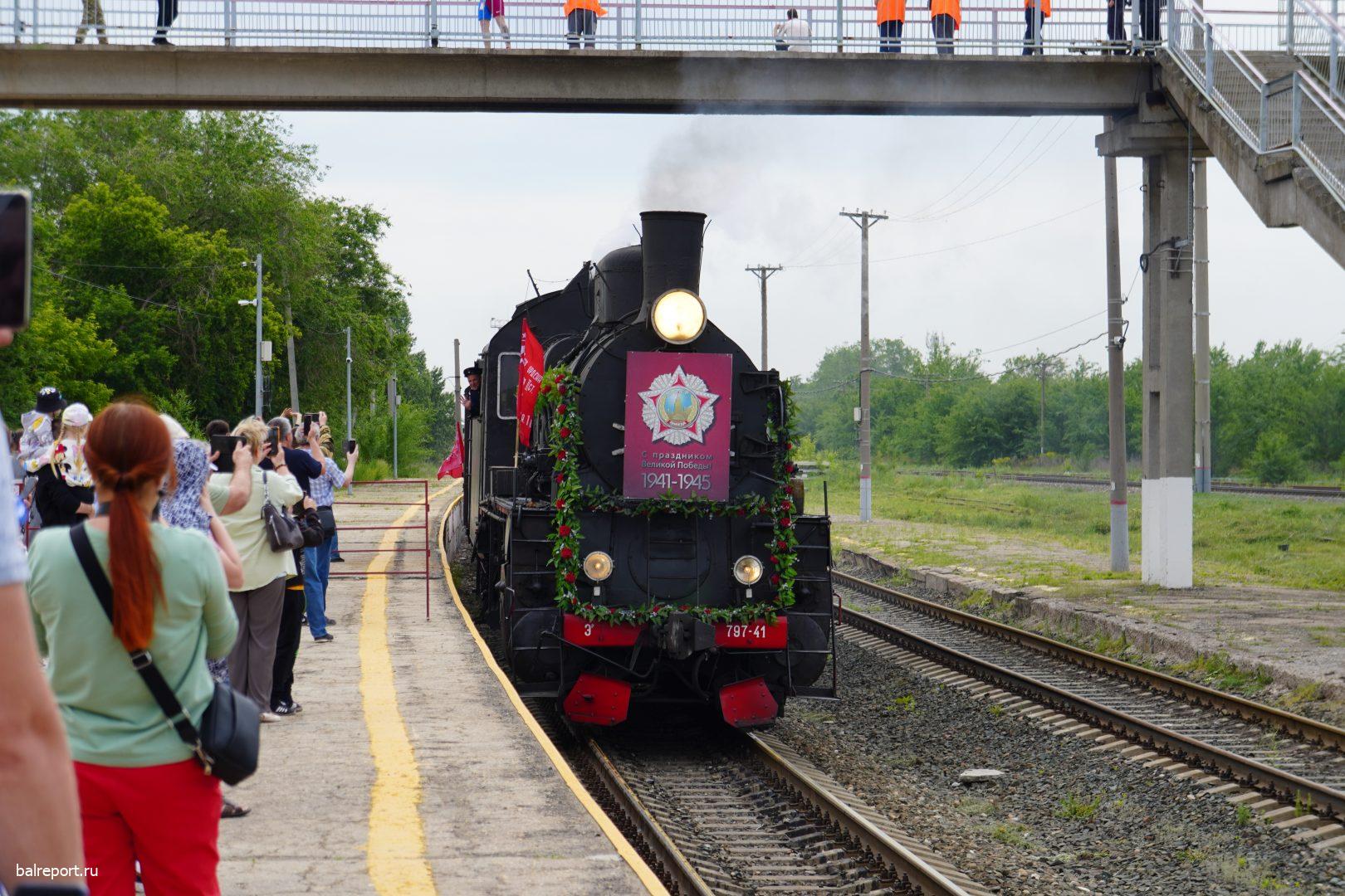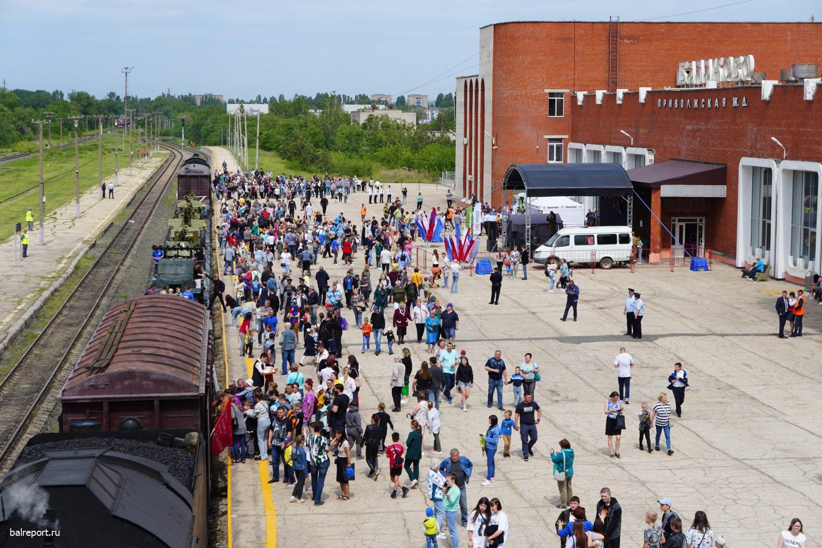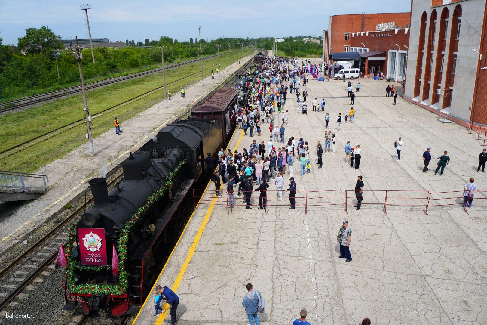 Сегодня на железнодорожный вокзал Балакова прибыл необычный поезд — «Воинский эшелон». Ретропоезд сформирован из двух действующих паровозов и шести платформ, на которых представлена военная техника. Наш город встретил состав праздничным концертом — артисты Городского центра искусств исполняли песни военных лет.