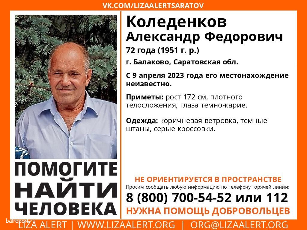 В Балакове пропал Коледенков Александр Федорович, 72 года (1952 г. р.)