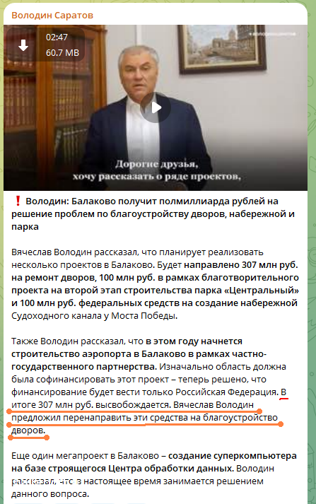Непростую задачу задал Вячеслав Володин губернатору Роману Бусаргину и главе БМР Сергею Грачёву во время минувшей встречи. Спикер Госдумы во всеуслышание объявил, что в региональном бюджете «освободились» чуть больше 300 миллионов рублей, которые должны были пойти на аэропорт в Балакове, и поручил направить их на закупку 12-ти троллейбусов. Но эти же деньги планировалось направить на ремонт дворов, и этой новостью обрадовали жителей города.