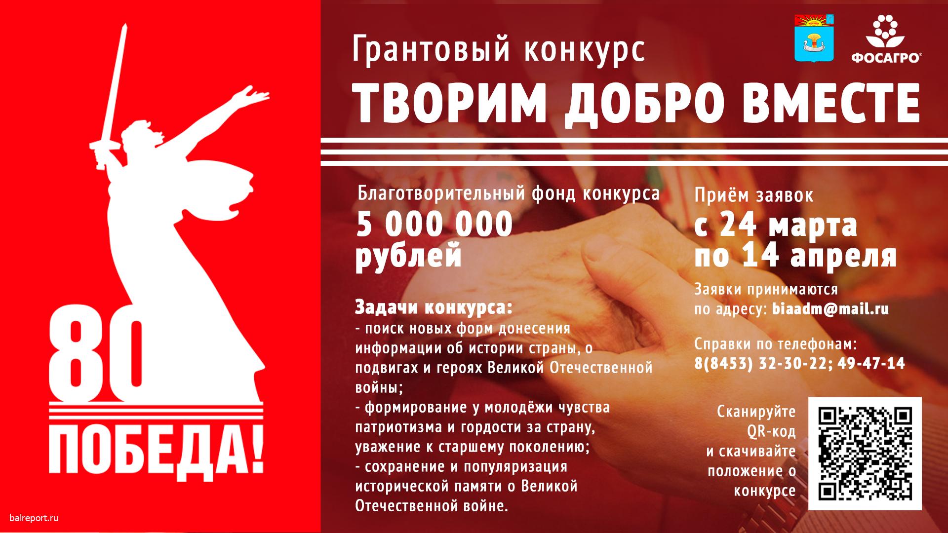 Третий год подряд администрация БМР и Балаковский филиал АО «Апатит» (Группа «ФосАгро») реализуют это важное общественное начинание. Участники конкурса выставляют на суд комиссии проекты, направленные на решение различных социальных задач в области экологии, благоустройства, образования, культуры, спорта, здравоохранения. В этом году организаторы решили сузить круг тем и посвятили конкурс предстоящему юбилею Великой Победы.