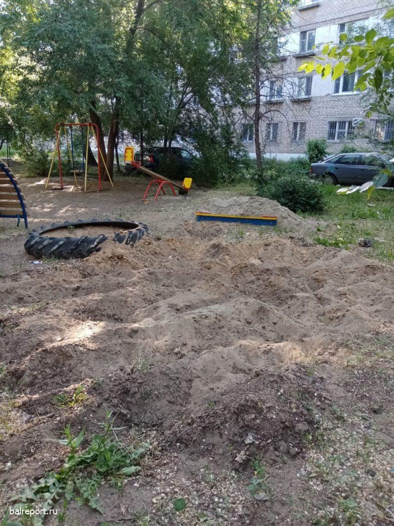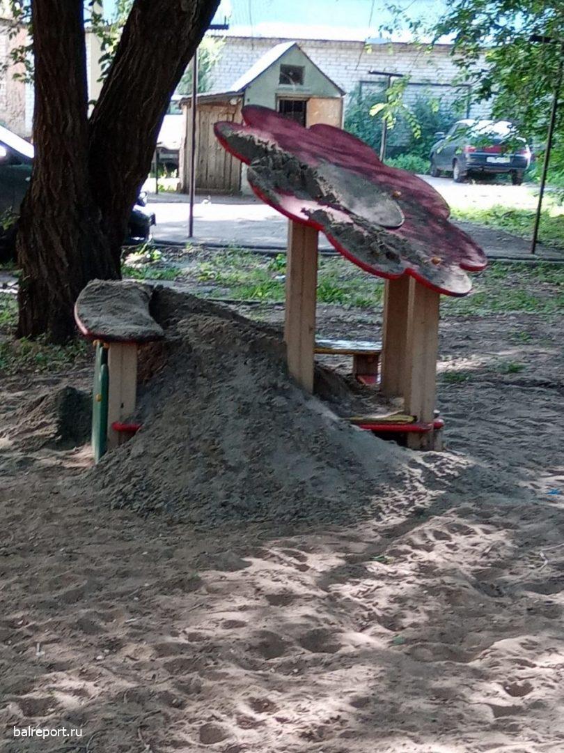 В других дворах Балакова игровые площадки превратились в огромные песочницы, поскольку работники «Комбината благоустройства» высыпали такое большое количество песка, что из-под него порой и «грибков» не видно. Неужели нельзя делать эту работу аккуратнее?