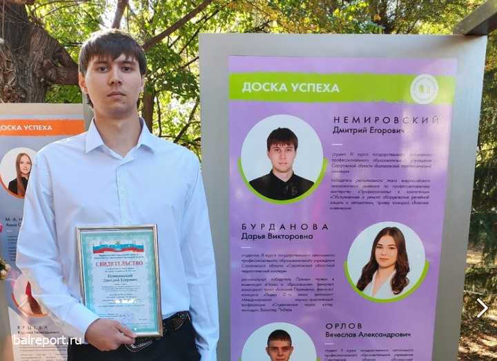 За достижение высот в учебе, спорте, искусстве, творчестве, науке и изобретательстве на Доску успеха молодежи были занесены 28 лучших обучающихся. Среди них студент Балаковского политехнического техникума Немировский Дмитрий Егорович, обучающийся 4 курса гр.18 спец.13.02.03 Электрические станции, сети и системы. За период обучения в техникуме Немировский Дмитрий достиг высокого уровня профессионального мастерства, что подтверждают его победы в региональном этапе всероссийского чемпионатного движения по профессиональному мастерству «Профессионалы» в компетенции «Обслуживание и ремонт оборудования релейной защиты и автоматики» и конкурсе «Военная инженерия».