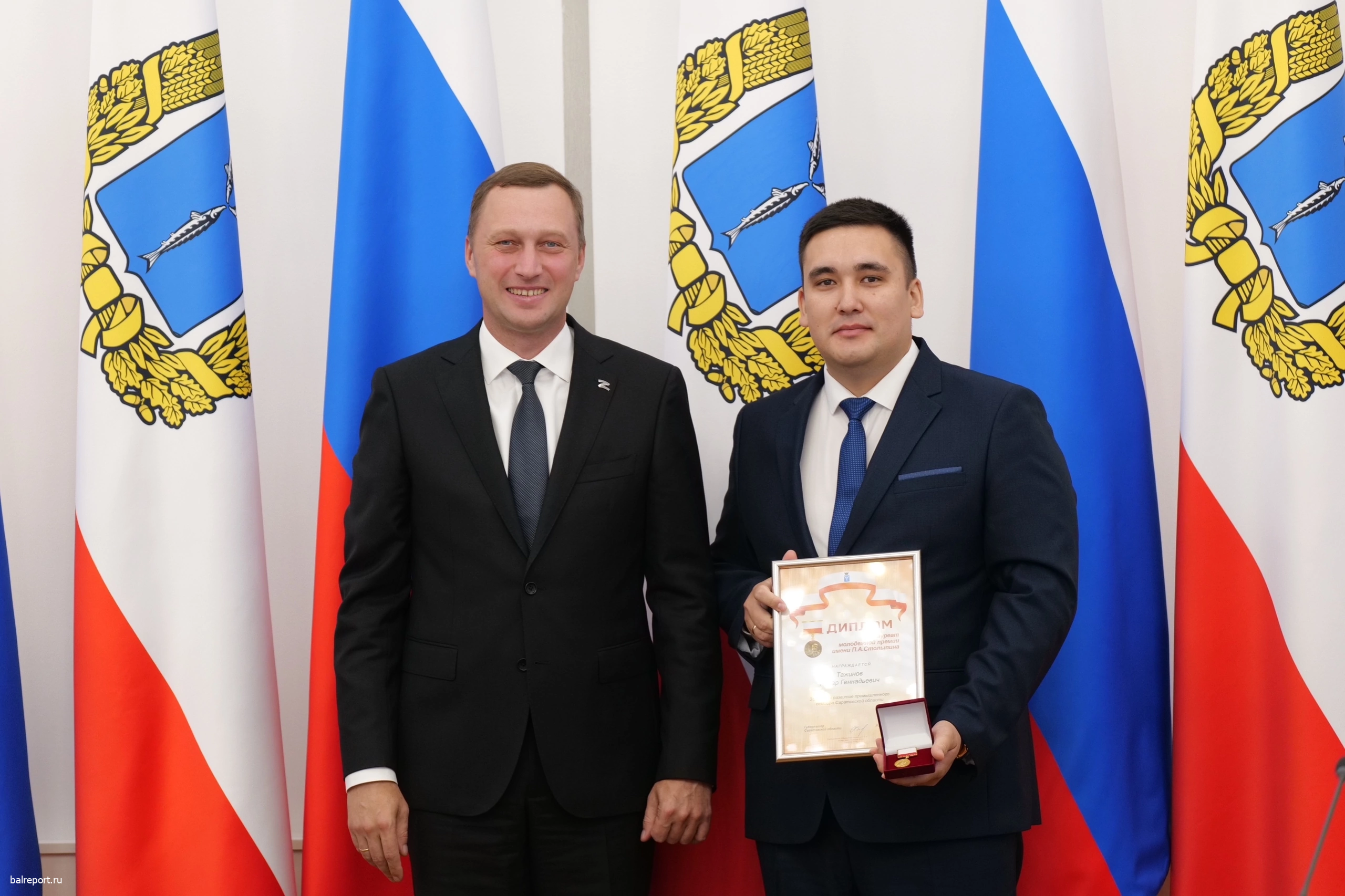 Губернатор Саратовской области Роман Бусаргин вручил ведущему инженеру Балаковской АЭС Назару Тажинову диплом и медаль «За вклад в развитие промышленного сектора Саратовской области».