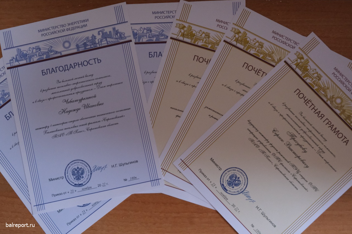 В честь профессионального праздника Дня энергетика шесть сотрудников Саратовского филиала «Т Плюс» за многолетний труд и профессионализм награждены почетными грамотами и благодарностями Министерства энергетики РФ.
