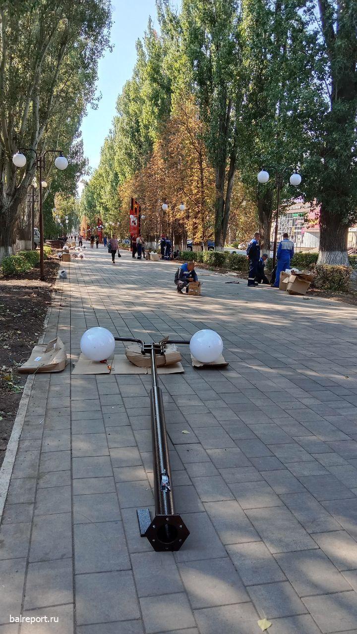 Работы по обновлению освещения на Аллее Героев по ул.Факел Социализма подходят к завершению. Сегодня рабочие устанавливают фонари к ранее подведённым электрическим сетям. Это большие шары в классическом стиле, которые будут освещать мягким светом пешеходную зону.