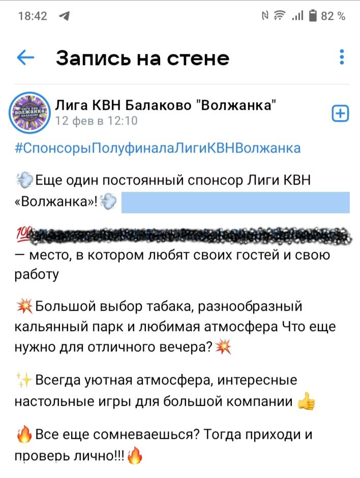 Во Дворце культуры Балакова возобновляются мероприятия. По крайней мере, «Молодежная инициатива» сообщает, что перенесенная из-за требований антитеррористической комиссии игра состоится 21 мая в 18:00 в Дворце культуры. Это будет долгожданный ФИНАЛ Лиги КВН г. Балаково «Волжанка»! И всё бы ничего, но среди спонсоров молодежного мероприятия, в котором участвуют в том числе и студенты колледжей/техникумов (они на первых курсах несовершеннолетние), значится кальян-бар. В своем представлении спонсоров в группе ВК «Молодежная инициатива» пишет, что это постоянный спонсор, приглашает всех прийти и попробовать кальян, «если ты сомневаешься»: мол, «большой выбор табака — что ещё нужно для отличного вечера?»