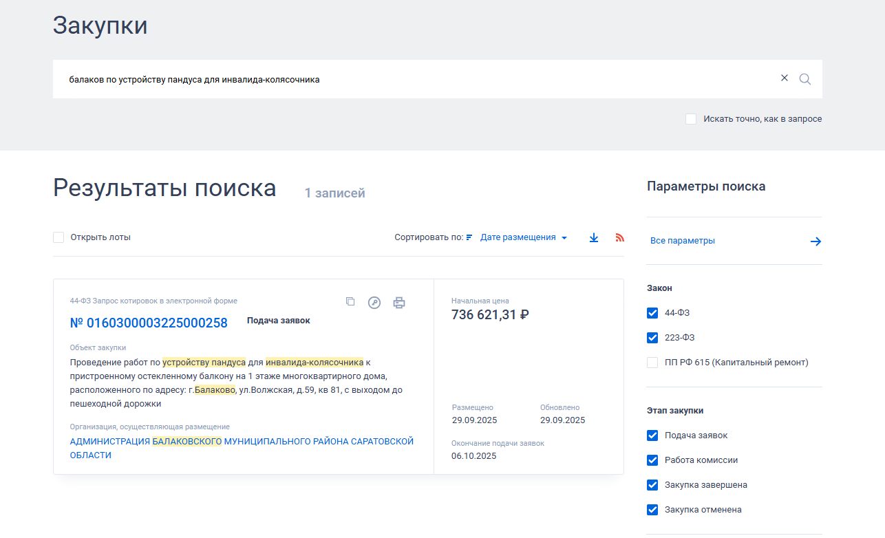 Не припомним, чтобы такое бывало в Балакове раньше, поэтому напишем, дабы сохранить в истории: администрация Балаковского района ищет подрядчика для проведение работ по устройству пандуса для инвалида-колясочника к пристроенному остекленному балкону на 1 этаже многоквартирного дома, расположенного по адресу: г.Балаково, ул.Волжская, д.59, кв 81, с выходом до пешеходной дорожки. Кстати, сайт закупок подтверждает, что это происходит впервые в нашем городе — чтобы за счёт бюджета обустраивали спуски для колясочников.