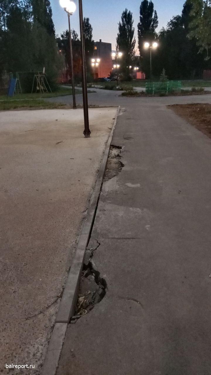 В сквере возле СОШ №18 уже не первый год проходит благоустройство. Здесь обустроили пешеходные дорожки в минувшем году, а в этом — установили интересные фонари с шарами. По задумке должен появиться и игровой комплекс, которого пока нет, но площадку для него забетонировали. И пока лили бетон, испортили тяжёлой спецтехникой пешеходную дорожку. Вдоль всей будущей детской площадки в асфальте — дыры! Можно было, конечно, при планировании всё это предусмотреть: сначала работа спецтехники, потом асфальт. Но у нас как всегда: одно «лечим», другое «калечим».