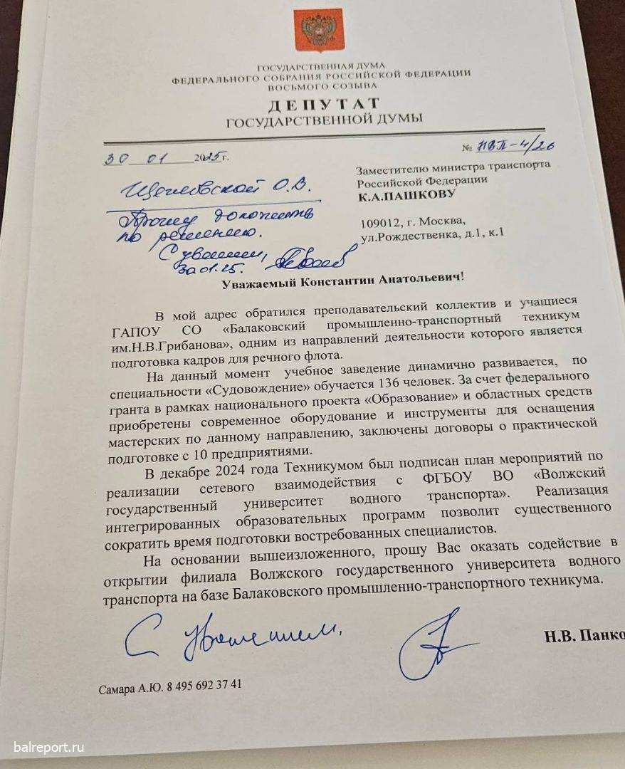 Депутат Госдумы Николай Панков встретился в Москве с заместителем министра транспорта РФ Константином Пашковым. Об этом он рассказал в своём телеграм-канале «Пара слоV». «Обсудили перспективы развития балаковского речного училища. Сейчас там обучается 136 студентов по специальности «Судовождение». Это перспективное направление для Балаково. При помощи Вячеслав Володина возрождаются речные пассажирские перевозки по Волге. В этом году будет приобретено 5 скоростных судов «Валдай». Районы готовят причальные сооружения для запуска первого маршрута к лету. Спикер всегда мыслит стратегически. Именно по его проекту историческое здание речного училища в Балаково получило вторую жизнь. Сейчас в нем оборудованы современные мастерские для качественного обучения студентов. Созданы условия для подготовки экипажей новых судов.Хорошим преимуществом для балаковцев станет возможность получить высшее образование по перспективным специальностям в родном городе. Поэтому обратился к Константину Пашкову с просьбой оказать содействие в открытии филиала Волжского государственного университета водного транспорта в Балаково. Губернатор Роман Бусаргин поддержал предложение об открытии филиала вуза у нас на базе балаковского речного училища. Отмечу, депутат Госдумы Виталий Ефимов оказал содействие в этом вопросе.О результатах рассмотрения нашего обращения, как всегда, расскажу открыто в этом канале», — отметил Николай Панков.