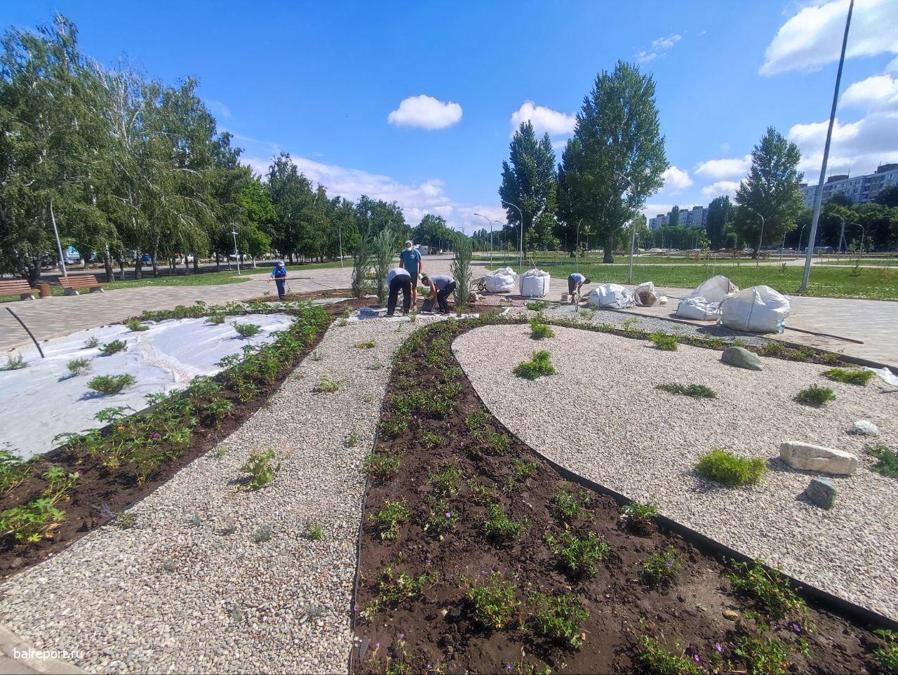 Шестой вопрос — озеленение. В прошлом и этом годах на зелёных территориях начали высаживать длинномеры — высокие деревья вместо маленьких саженцев. Тем самым решаются две проблемы: приживаемость и скорейший эффект затенения территории. Ещё около 100 деревьев по проекту должны высадить. Кроме этого появятся и кустарники. Сейчас озеленители оборудуют два рокария — это декоративные композиции из камней и растений для придания клумбам эстетичного вида. На них высаживают многолетние растения, которые со временем заполнят пространство.