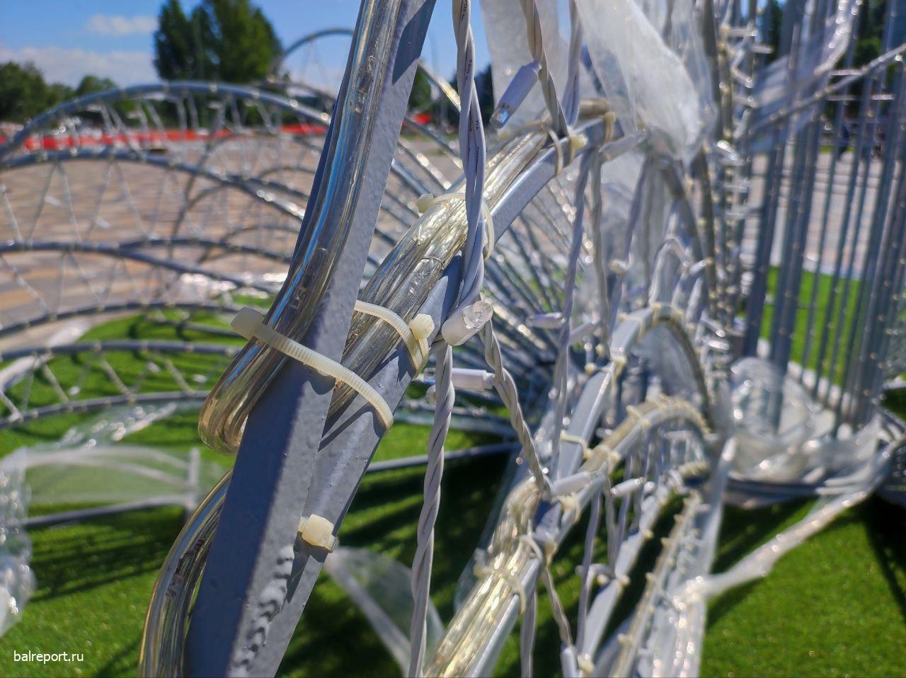 Пятый вопрос — световой фонтан. Он вызывает недоумение в качестве исполнения. На металлическую конструкцию обычный дюралайт прикрепили пластиковыми стяжками, которые уже рассыхаются от солнца. Сама конструкция — не антивандальная, но подрядчик напомнил про камеры наблюдения, которые будут следить за порядком. «Сломать можно что угодно», — заявил представитель строительного контроля (Дирекция капитального строительства) Андрей Троилов. Кстати, вокруг светового фонтана появится ограждение, а зимой его будут убирать, чтобы установить новогоднюю ёлку.