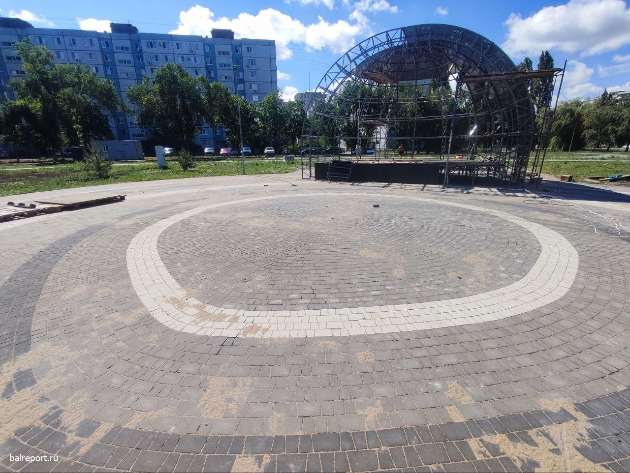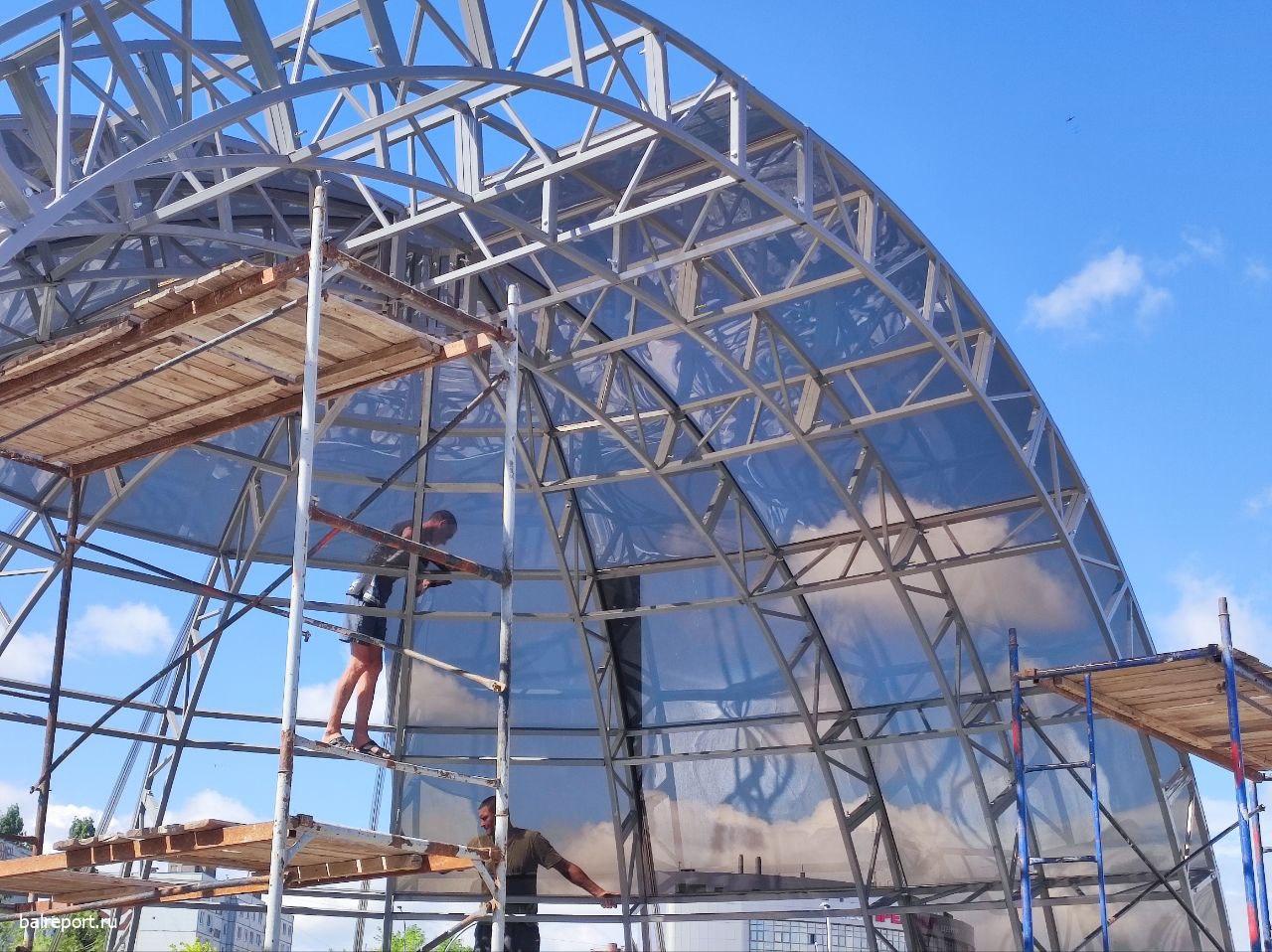 Четвертый вопрос — сцена. Для чего она в парке? Многие горожане в комментариях отмечают, что она слишком маленькая для проведения городских мероприятий. Оказывается, она здесь не для этого! На ней будут проводить небольшие праздники с выступлениями юных артистов. Перед сценой будут две лавочки для зрителей. Покрытие купола — поликарбонат. За сценой установят вагончик для переодевания выступающих.