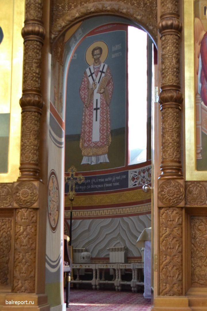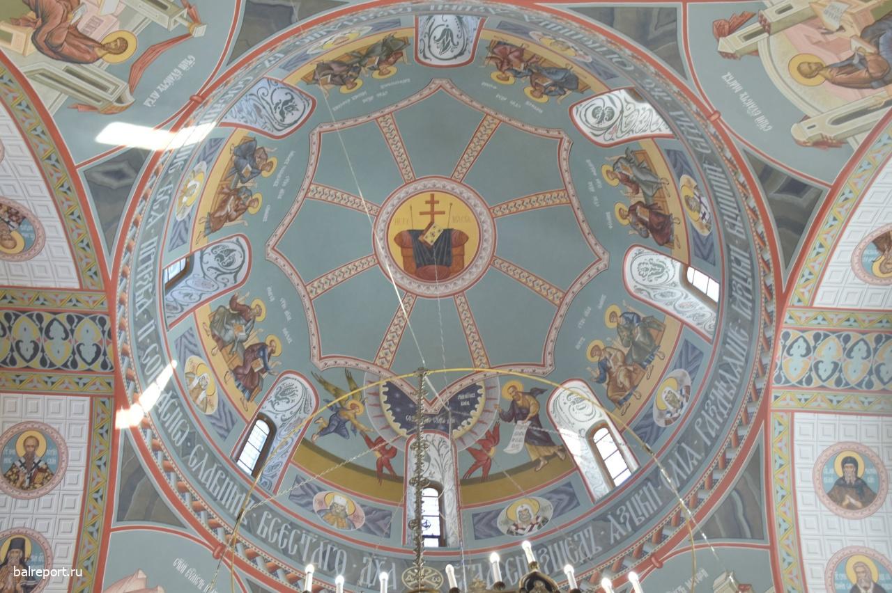 В верхней части собора роспись венчает купол. Здесь изображён Престол Божий, вокруг которого располагаются апостолы. Ниже представлены образы святых и подвижников благочестия, в том числе — сонм Саратовских святых. Среди них особое место занимает святой праведный Александр Чагринский, в церковной традиции также именуемый Александром Балаковским. В народе его с любовью называют Чагринским батюшкой. Святой праведный Александр на протяжении 38 лет нёс пастырское служение в Балаково, а завершил свой земной путь в Иверском женском монастыре Самарской земли, где был духовником сестёр. Там же ныне покоятся его мощи. Его образ в росписи — напоминание о святости, выросшей рядом с нами, на нашей земле.