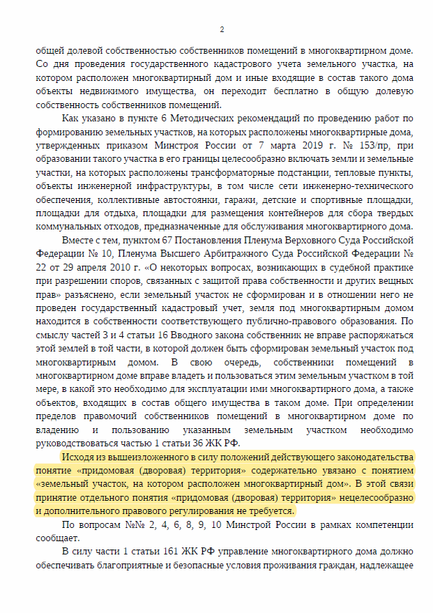 Кроме этого Минстрой разъяснил: придомовая территория — это земельный участок, на котором расположен многоквартирный дом и иные объекты, входящие в состав такого дома. Они являются общей долевой собственностью собственников помещений в многоквартирном доме со дня проведения государственного кадастрового учета земельного участка. За его содержание и отвечает УК.