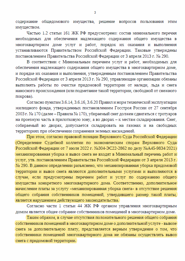Механизированная уборка придомовой территории и вывоз снега являются дополнительными услугами и выполняются в случае, если предусмотрены перечнем работ и услуг по содержанию общего имущества конкретного многоквартирного дома. Соответственно, дополнительное начисление платы за услугу «механизированная уборка снега» в отсутствие решения общего собрания собственников помещений, утвердившего размер такой платы, является нарушением действующего законодательства.