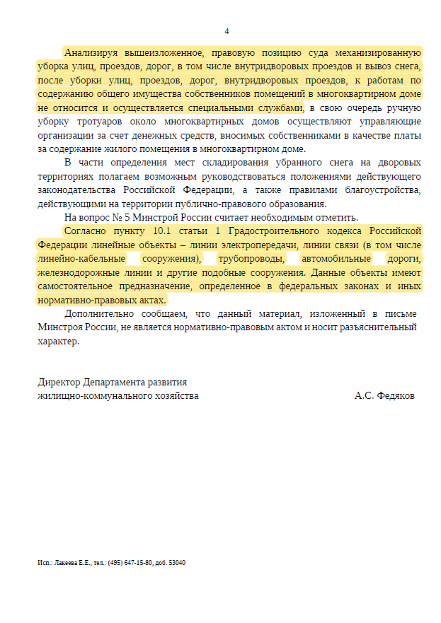 Федеральное ведомство разъяснило, что «анализируя нормативно-правовую базу, а также правовую позицию суда, механизированную уборка улиц, проездов, дорог, в том числе внутридворовых проездов и вывоз снега, после уборки улиц, проездов, дорог, внутридворовых проездов, к работам по содержанию общего имущества собственников помещений в многоквартирном доме не относится и осуществляется специальными службами. В свою очередь ручную уборку тротуаров около многоквартирных домов осуществляют управляющие организации за счет денежных средств, вносимых собственниками в качестве платы за содержание жилого помещения в многоквартирном доме«.