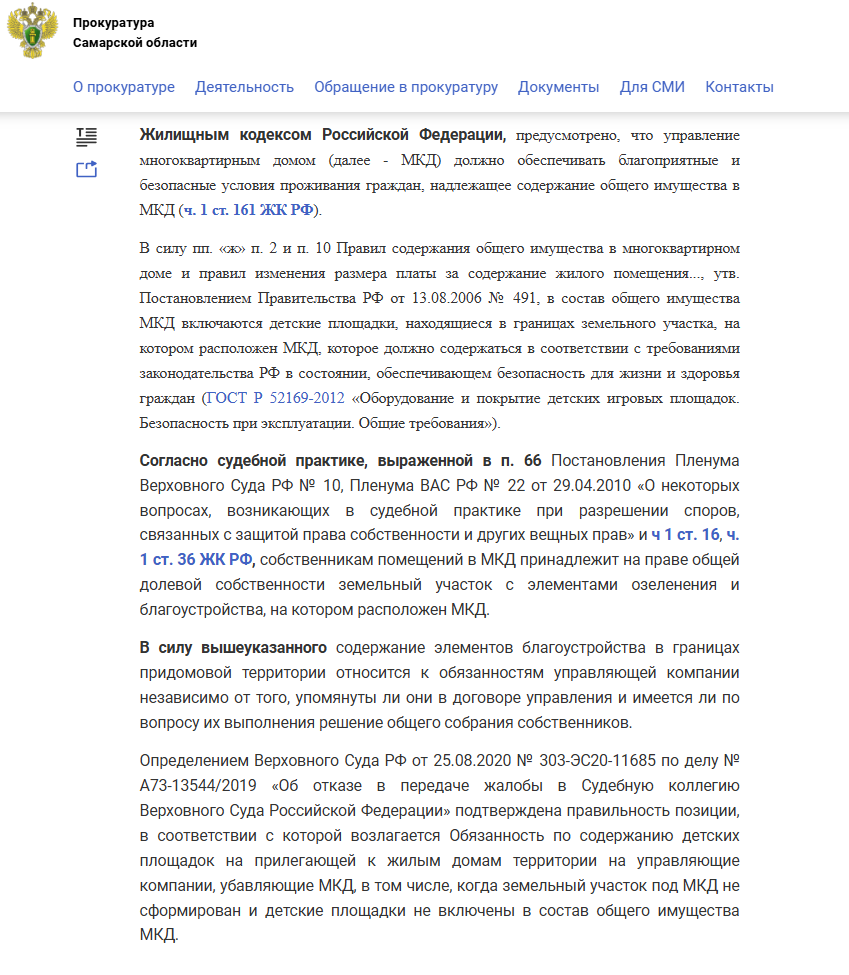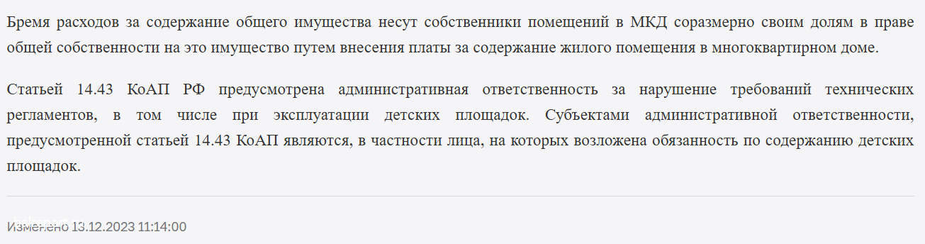 Между тем, согласно п. «ж» п. 2 Правил № 491 в состав общего имущества МКД включаются детские площадки, расположенные в границах земельного участка, на котором расположен МКД. Вот за ними управляющие компании и должны следить независимо от того, упомянуты ли они в договоре управления, имеется ли по вопросу их выполнения решение ОСС. Жителям стоит иметь это в виду. Прокуратура разъяснила эти моменты.