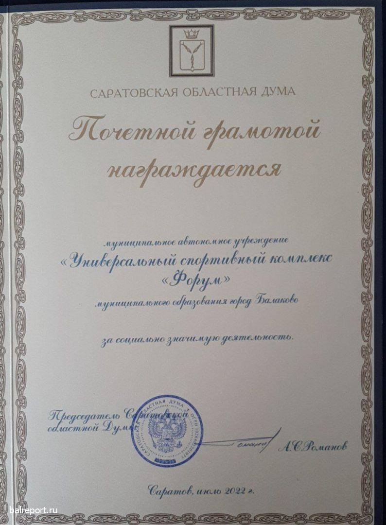 Сегодня постоянно действующее совещание в администрации Балаковского района началось с торжественного поздравления. Руководителю УСК «Форум» Олегу Удилову вручили почетную грамоту за социально значимую деятельность учреждения. Вручал ее новоиспеченный областной депутат Владимир Земсков.