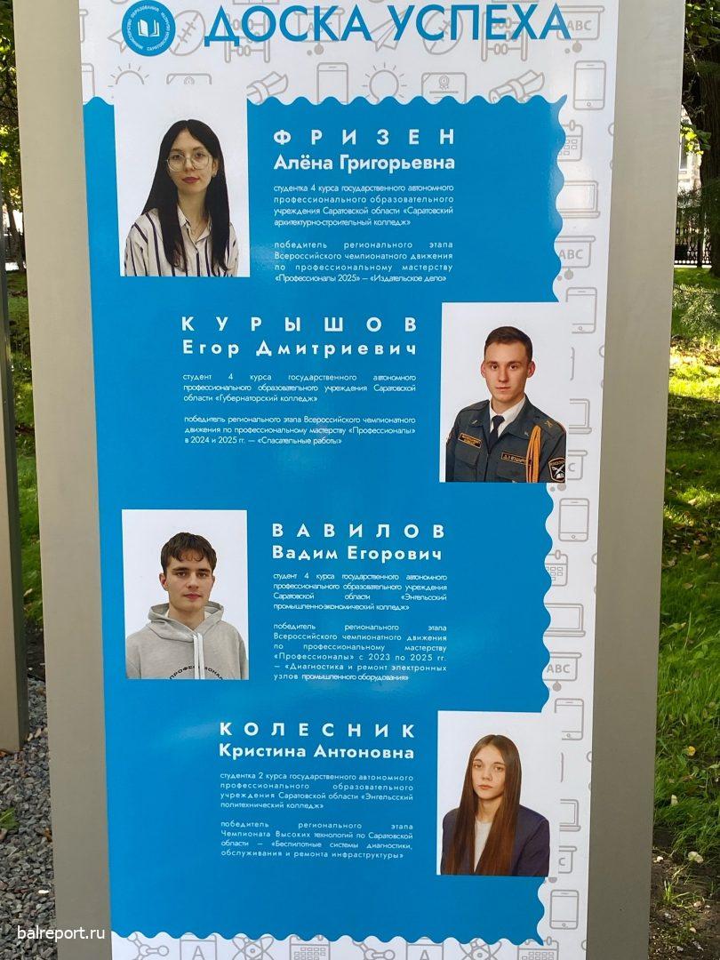 Региональная галерея обновляется ежегодно. В этом году портреты 28 молодых людей занесены на Доску успеха молодёжи Саратовской области. Это ребята, добившиеся побед в региональных, всероссийских и международных олимпиадах, спортивных соревнованиях и творческих конкурсах. На Доску успеха занесён студент 4 курса Губернаторского колледжа Егор Курышов, ставший победителем регионального этапа Всероссийского чемпионатного движения по профессиональному мастерству «Профессионалы» в 2024 г. и призёром (2-е место) Национального чемпионата «Профессионалы» по компетенции «Спасательные работы» в 2025 г.