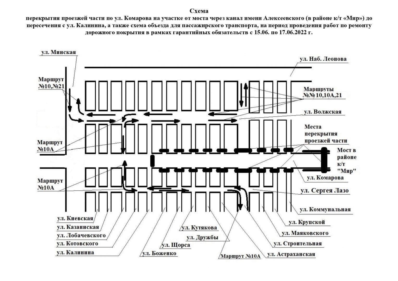 В связи с запланированными дорожными работами по замене асфальтового покрытия по ул.Комарова с 15 по 17 июня будет организовано перекрытие автодороги от моста в районе к-тр «Мир» до пересечения с ул. Калинина. Движение городских автобусных маршрутов № 10; № 10А; № 21 будет осуществляться в объезд данного участка.