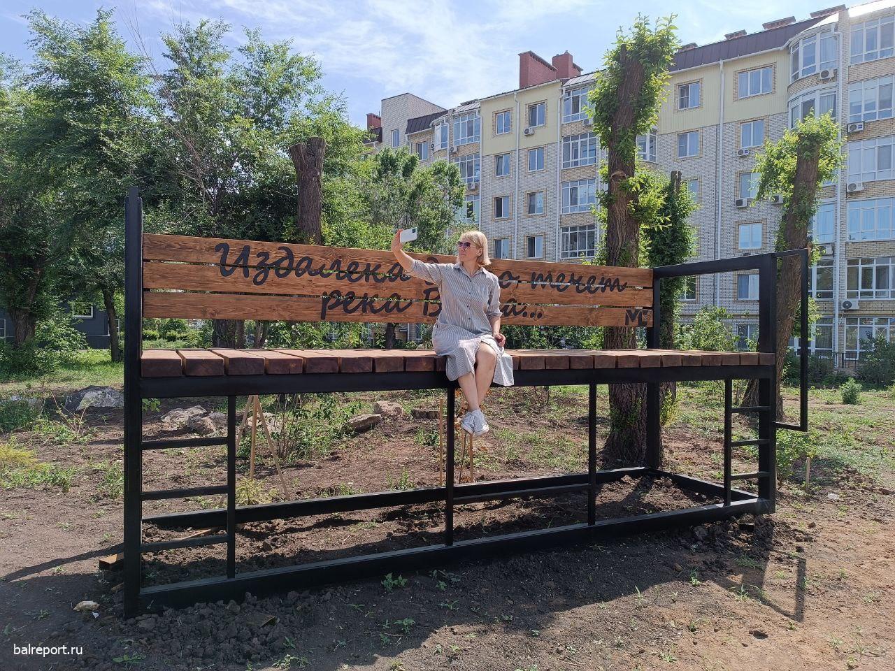 На спинке лавочки — цитата из песни про Волгу, и это вполне объяснимо: арт-объект стоит на берегу Судоходного канала, и с него будут видны проплывающие теплоходы, Мост Победы и будущую благоустроенную набережную.