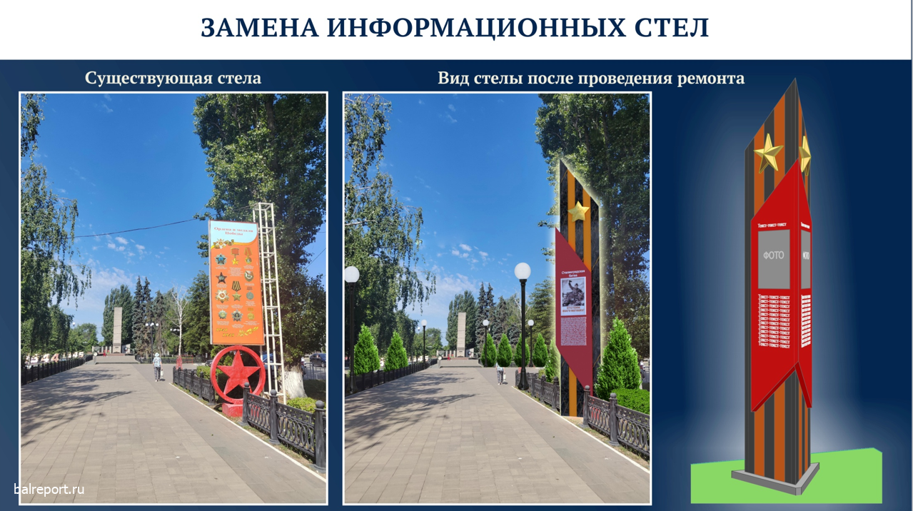 Старые информационные стелы заменят на новые в виде Георгиевских лент. На прежних баннерах уже не читается информация о воинах, поэтому решено их восстановить в обновлённом виде.