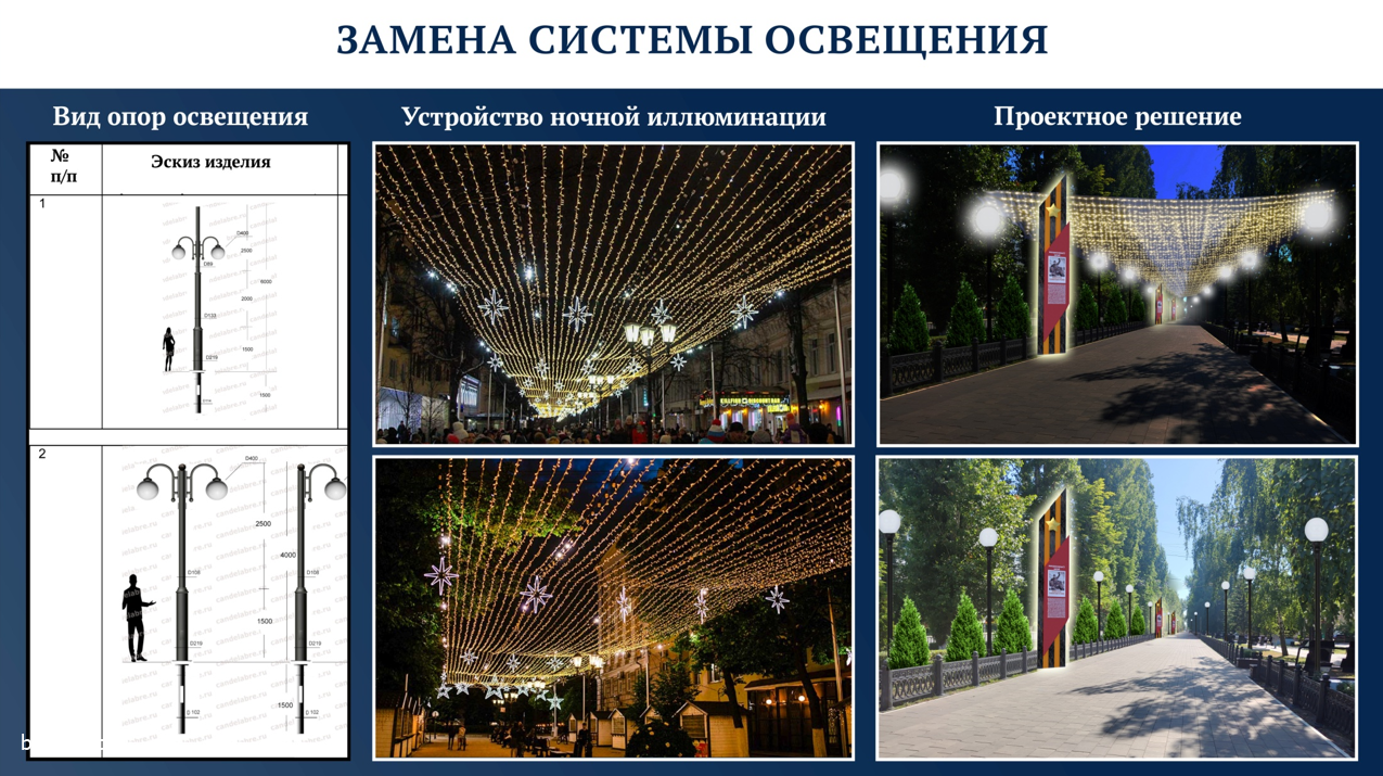 Проведут и замену системы освещения: установят новые одинаковые фонари, а также обустроят так называемое «звёздное небо». Кстати, подобное праздничное освещение используют на Аллее Героев в Волгограде.