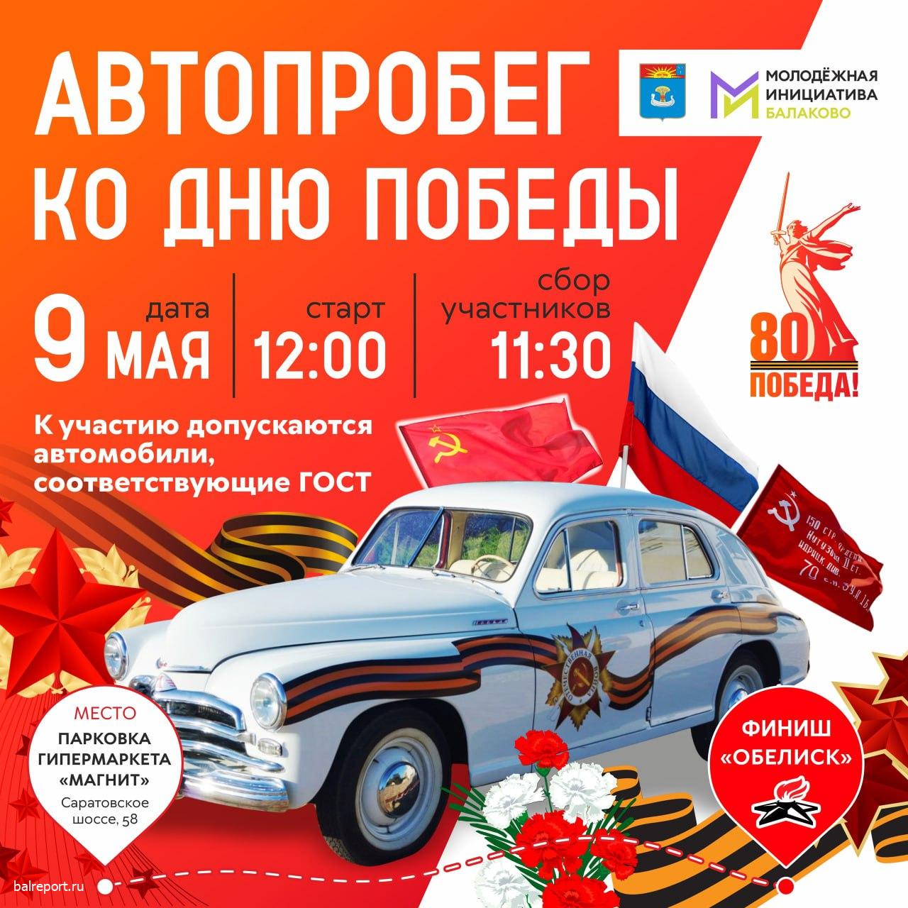 Старт автопробега: парковка гипермаркета «Магнит» (ул. Саратовское шоссе, 58). Сбор участников: с 11:30 часов. Финиш автопробега: «Аллея Героев» (Обелиск памяти балаковцам, погибшим в ВОВ).