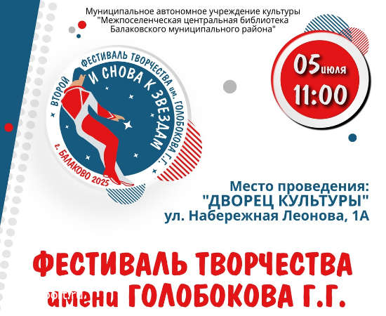 5 июля межпоселенческая центральная библиотека проводит второй фестиваль творчества им. Геннадия Голобокова «И снова к звёздам». Он пройдет во Дворце культуры (Набережная Леонова, 1А). Начало в 11.00.