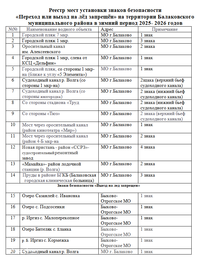 Перечень потенциально-опасных участков водоемов в осенне-зимний период 2025 – 2026 годов на территории Балаковского района: