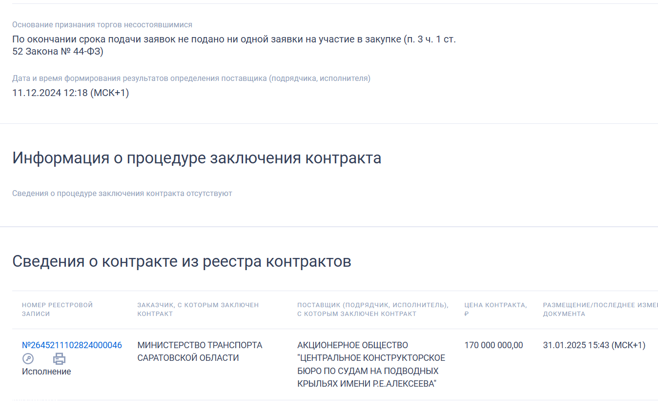 В декабре 2024 года был объявлен аукцион ещё на три судна, уже по 170 миллионов рублей. Но не было подано ни одной заявки! Но при этом договор всё-таки был заключен с тем-же заводом-изготовителем.