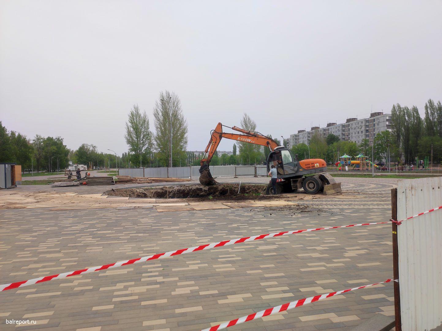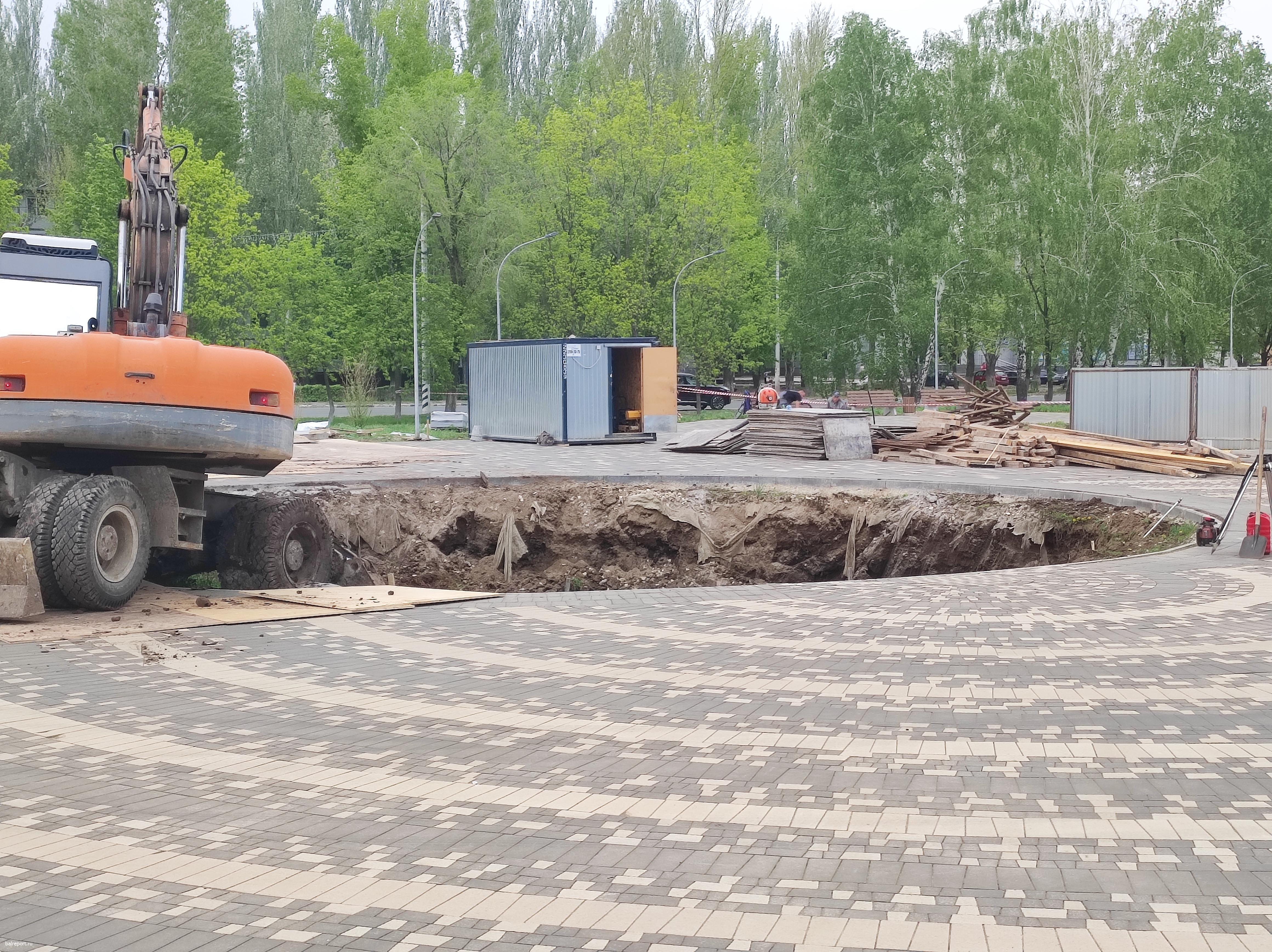 Круглая клумба по центру парка станет фонтаном. Прямо сейчас экскаватор копает котлован под чашу. Чтобы не испортить тротуарную плитку, рабочие уложили листы фанеры.