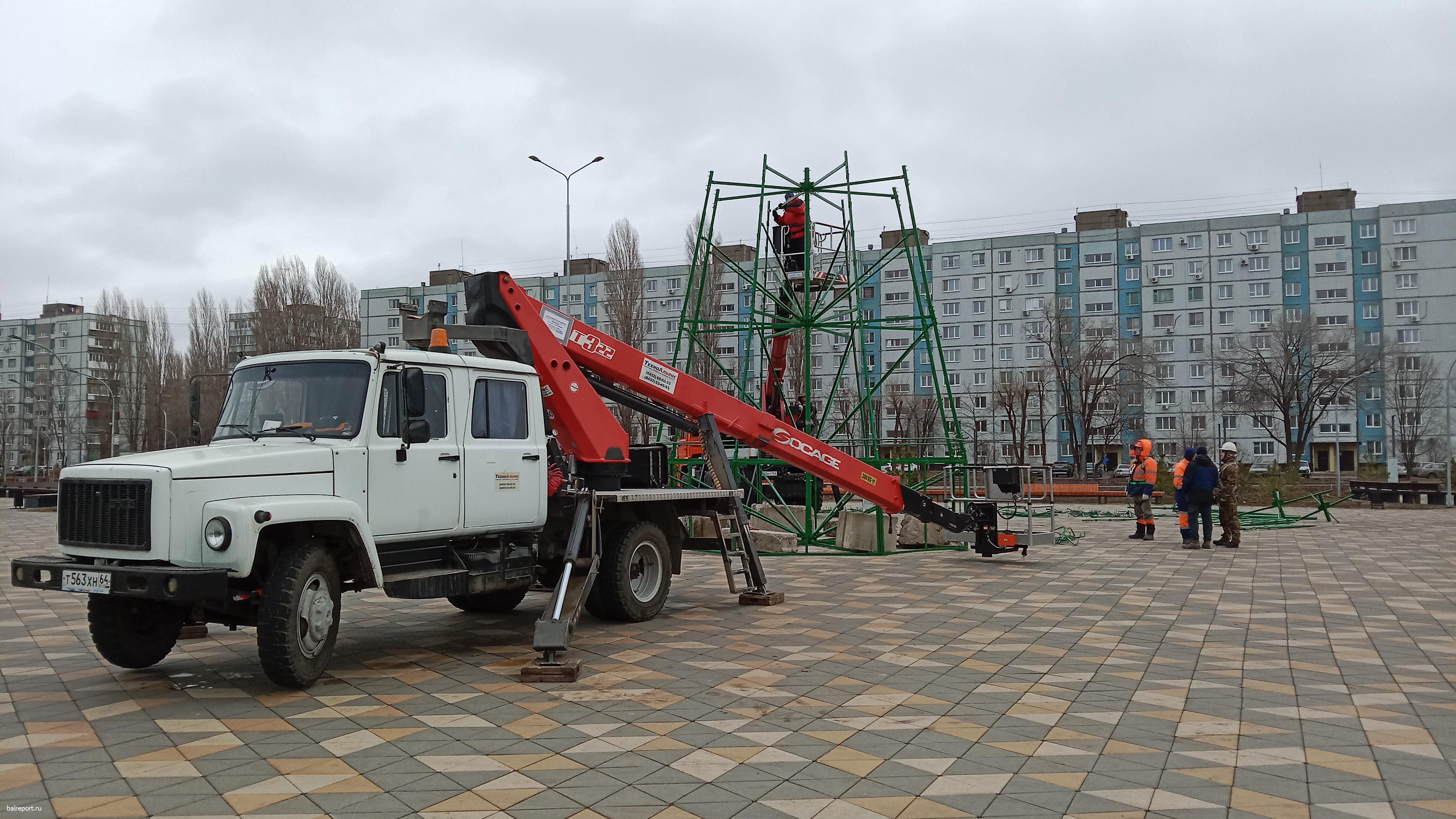 Рабочие Комбината благоустройства начали сборку конструкции главной городской ёлки в парке «Центральный». Ее устанавливают на места светового фонтана, который перенесен на место закрытого обычного фонтана. Сейчас его подключают к электричеству.