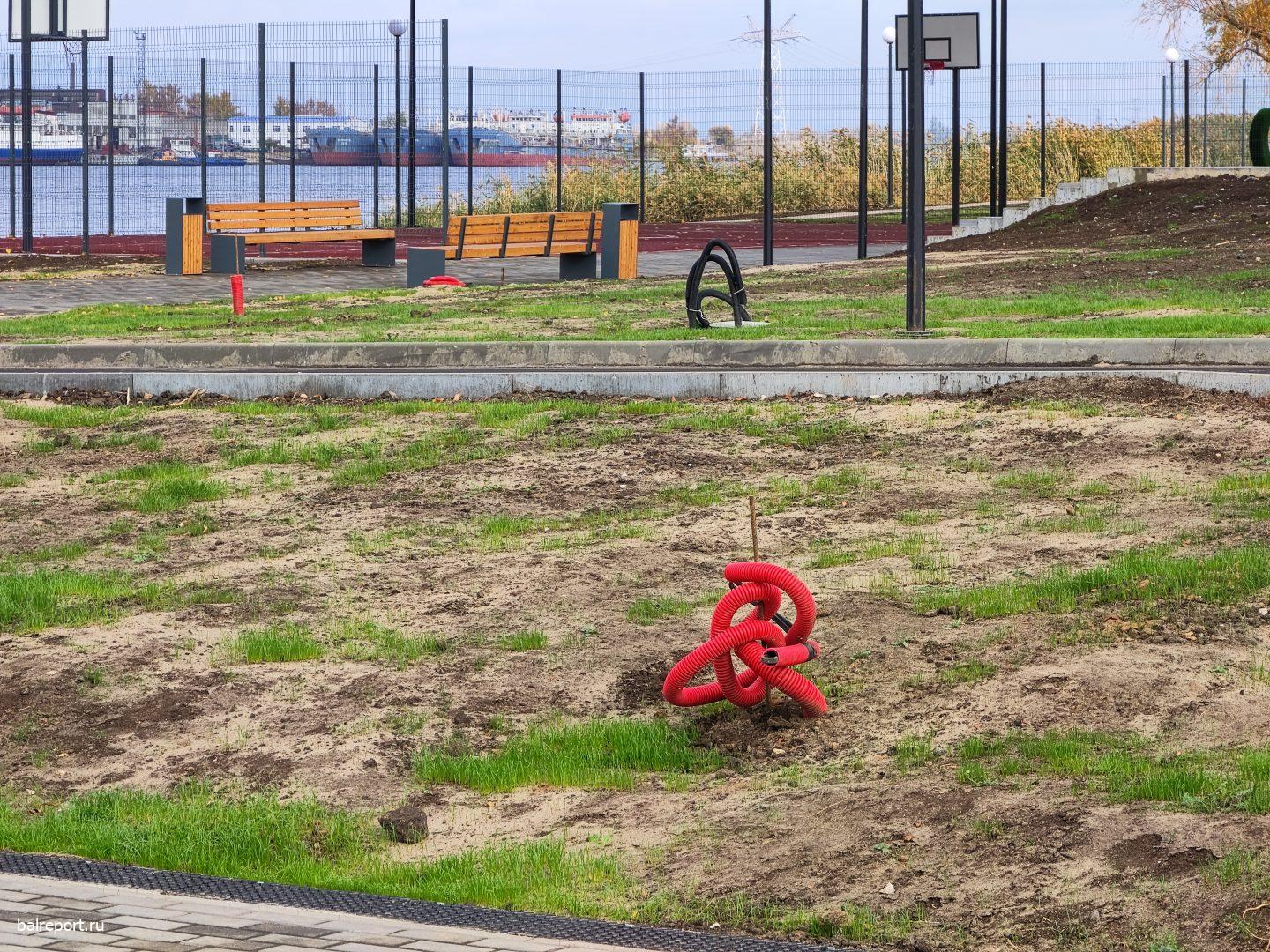 Большой вопрос и по отсутствию на некоторых пешеходных тропинках какого-либо покрытия. Там, по заверениям подрядчика, будет настил из лиственницы. Но что-то не «срастается» с этим покрытием: